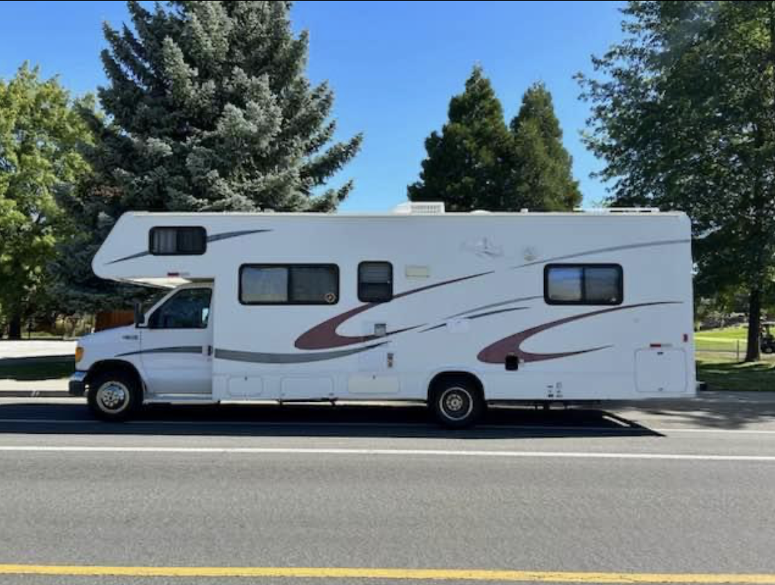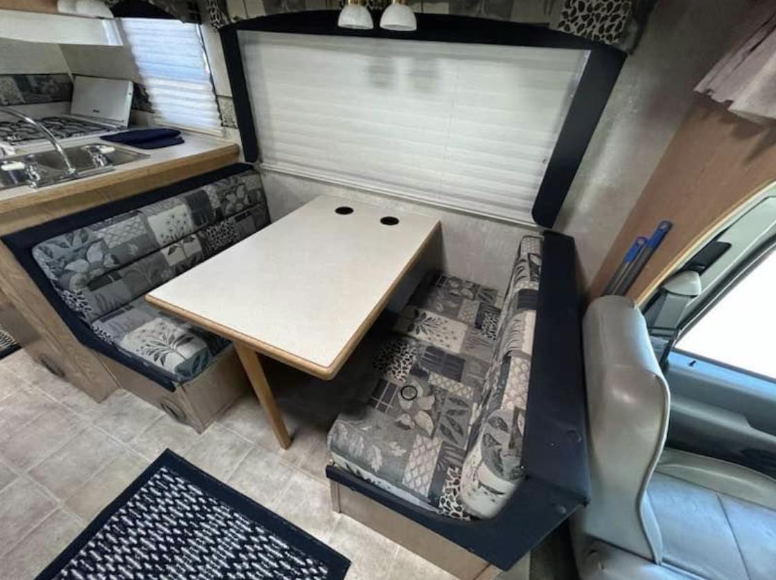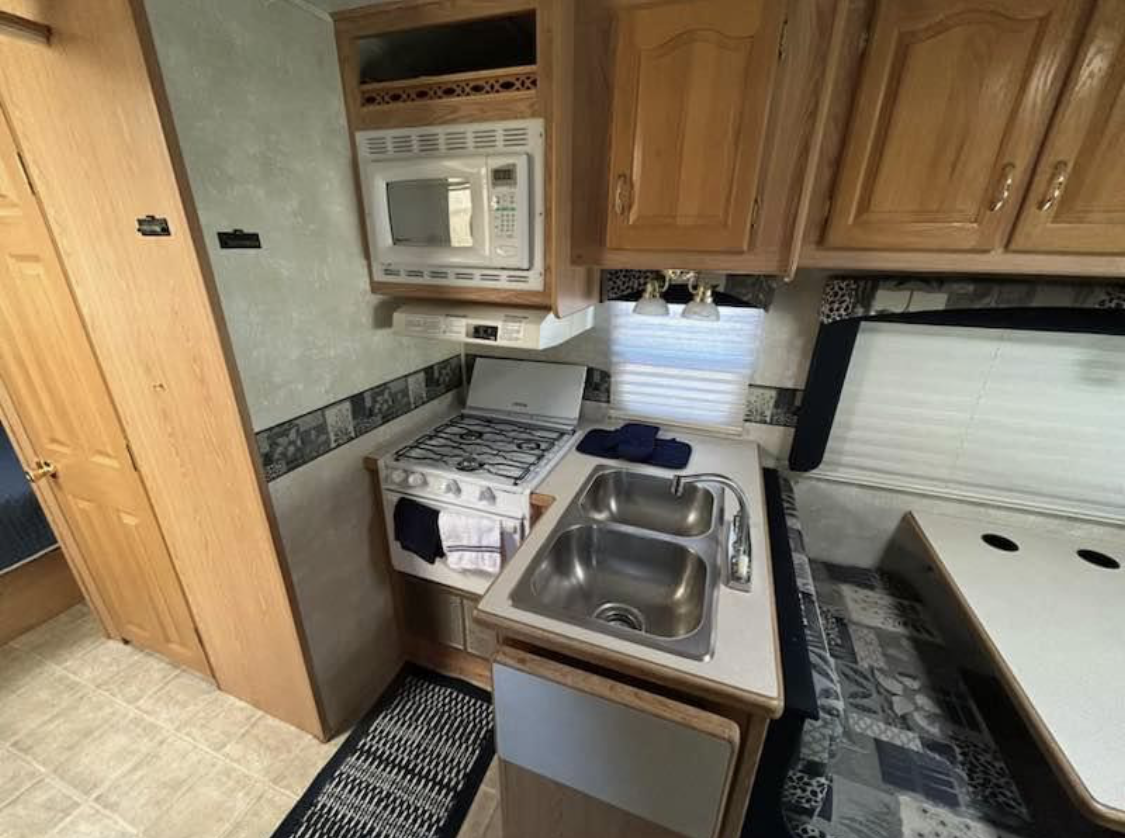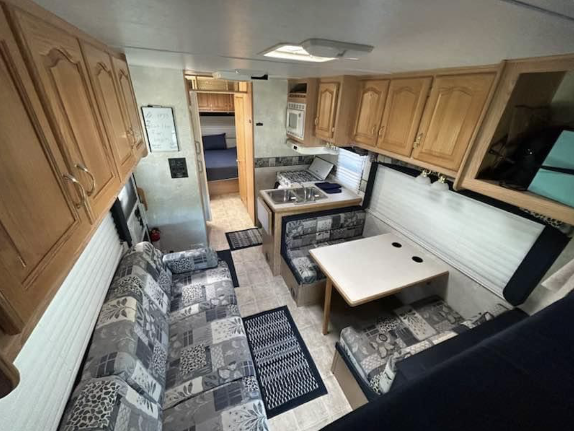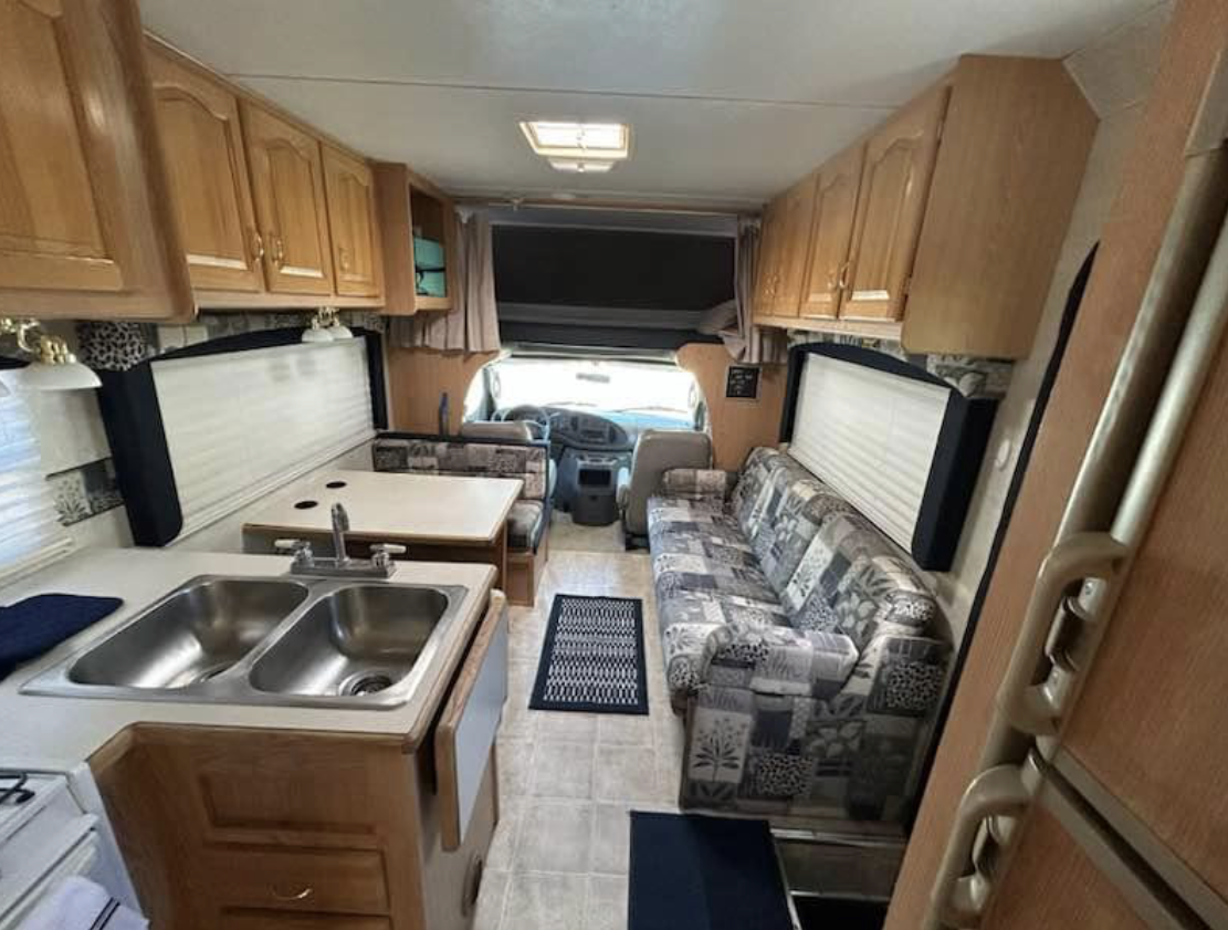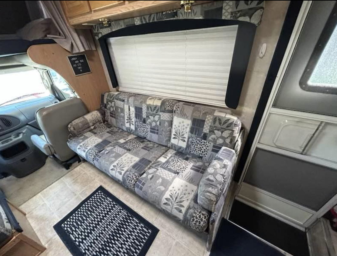 With space for 6-8 people to sleep comfortably, this RV includes a living area with a dinette that converts to a bed, a futon style sofa bed and a large over-cab bed. The kitchen has a stove with oven, microwave and refrigerator for all of your cooking needs.