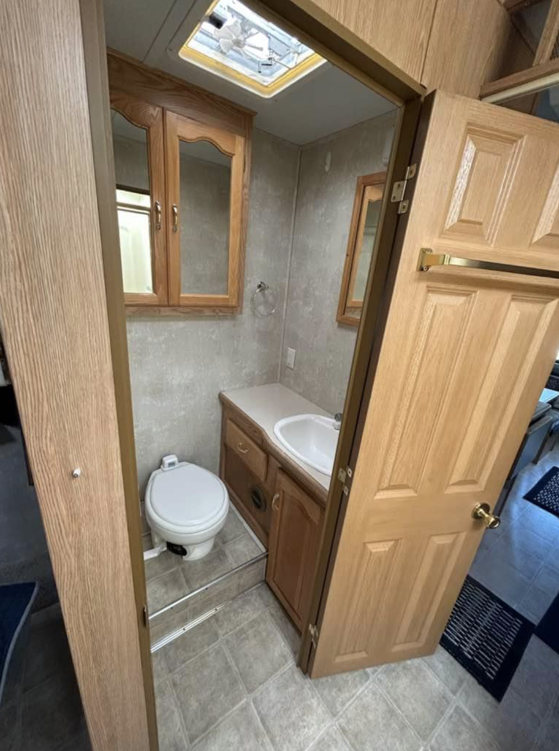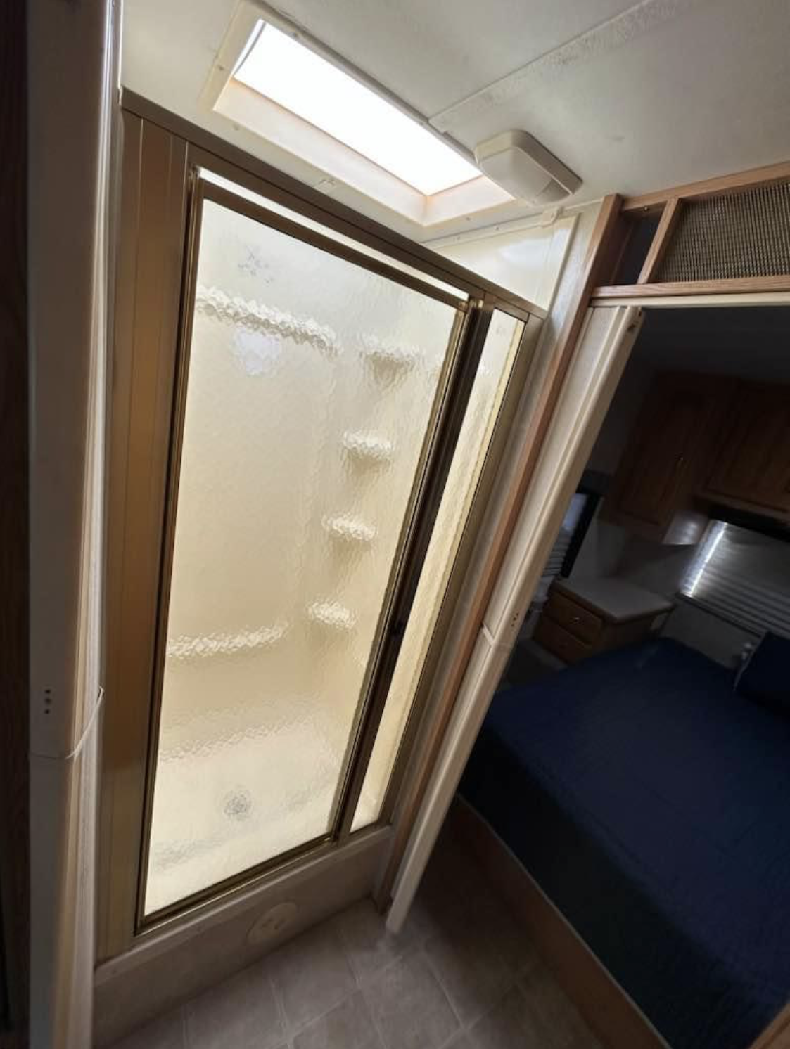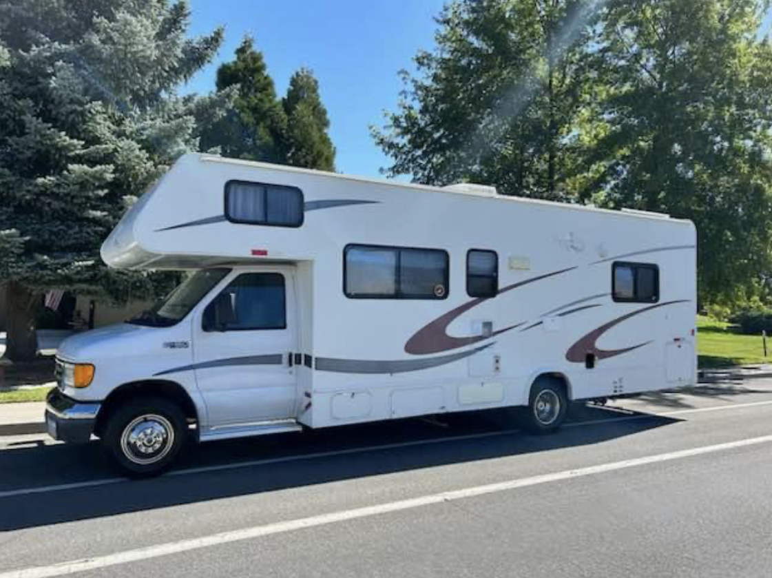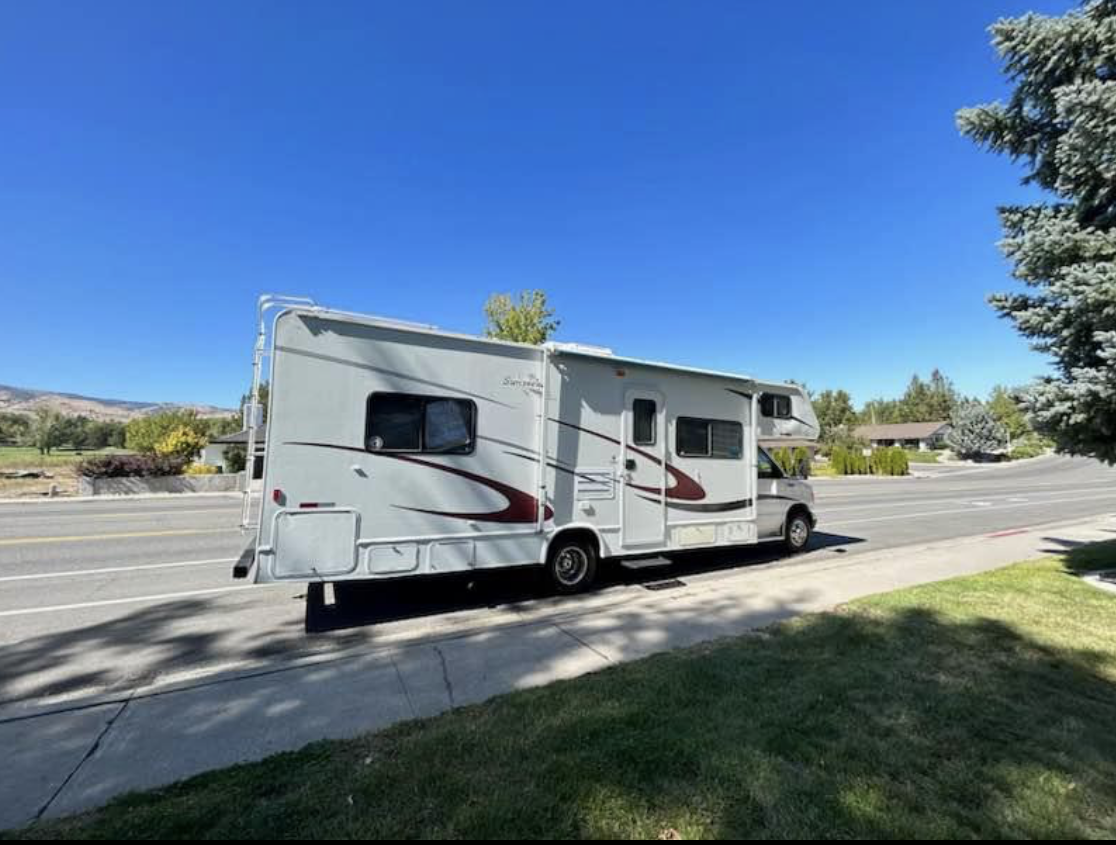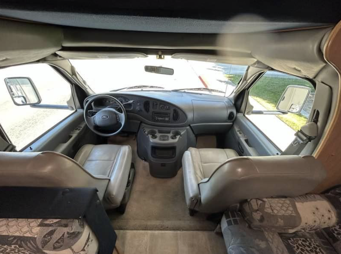 With space for 6-8 people to sleep comfortably, this RV includes a living area with a dinette that converts to a bed, a futon style sofa bed and a large over-cab bed. The kitchen has a stove with oven, microwave and refrigerator for all of your cooking needs.